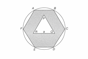 Q.14 ABCDEF is a regular hexagon and PQR is an equilateral triangle of side \( a \). The area of the shaded portion is \( X \) and CD : PQ = 2 : 1. Find the area of the circle circumscribing the hexagon in terms of \( X \).