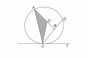 Q.19 In the given diagram, CT is tangent at C, making an angle of 45° with CD. O is the centre of the circle. CD = 10 cm. What is the perimeter of the shaded region (\( \triangle AOC \)) approximately?