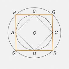 Q.51 Two concentric circles with centre O are given. PQRS is a square inscribed in the outer circle and circumscribes the inner circle. Find the ratio of the perimeter of the outer circle to that of polygon ABCD.