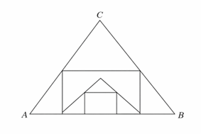 Q.6 In the given figure, ABC is an equilateral triangle inscribing a square of maximum possible area. Again, in this square, there is an equilateral triangle whose side is same as that of the square. Further the smaller equilateral triangle inscribes a square of maximum possible area. What is the area of the innermost square if each side of the outermost triangle be 0.01 m?